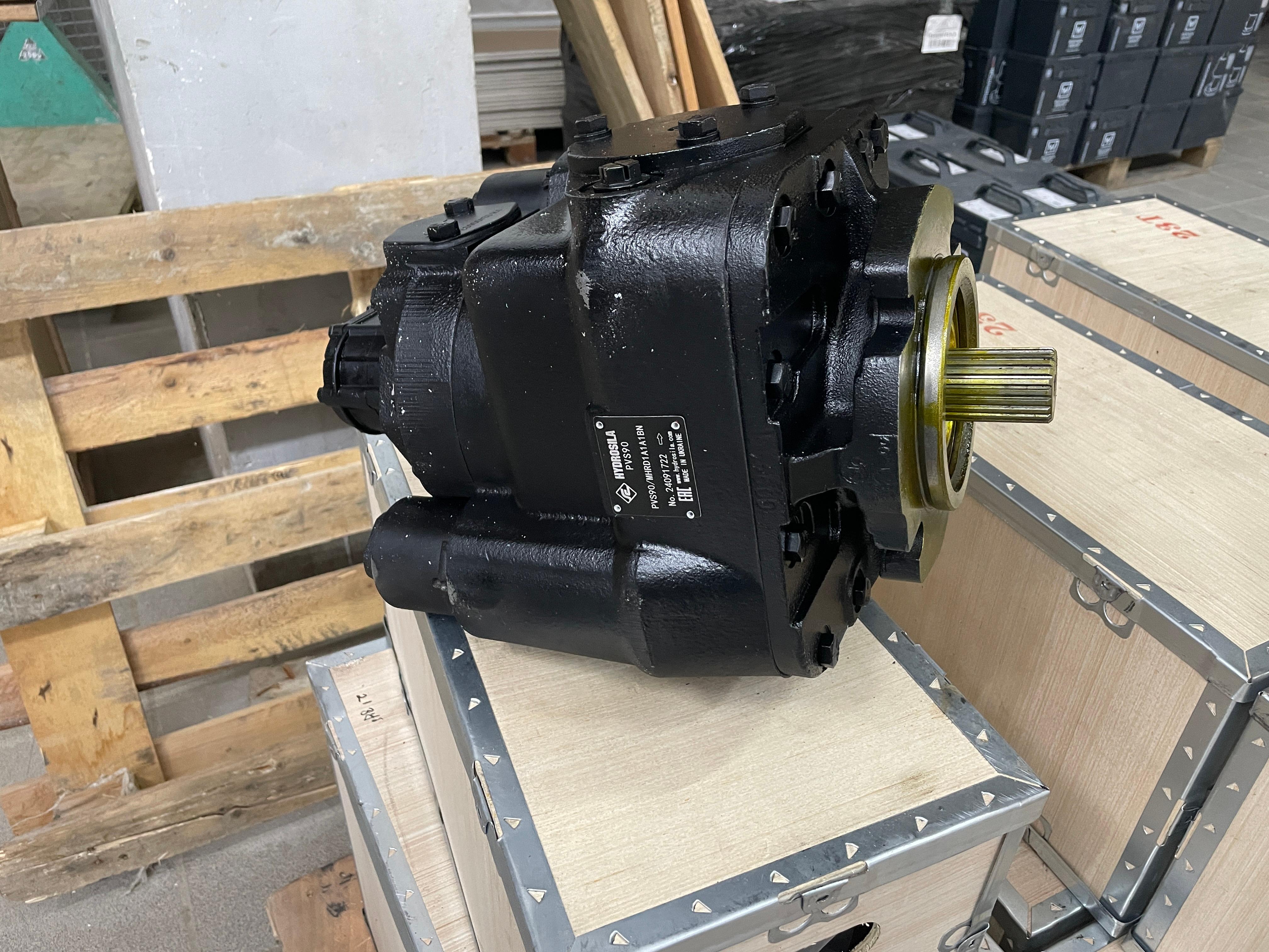 Гидронасос аксиально-поршневой используется на различных видах дорожно строительной техники. Аксиально-поршневой насос НП-90 является основной частью объемной гидростатической трансмиссии (ГСТ-90), состоящих из насоса и гидромотора МП-90, работающих по закрытой схеме. Используются в гидроприводах хода мобильных машин – зерноуборочных и других комбайнах, гидроприводах технологического оборудования – автобетоносмесителях, дорожных уплотнителях и прочих машинах. Подача аксиально-поршневого насоса прямо пропорциональна частоте вращения ротора и рабочему объему, который регулируется путем изменения угла поворота наклонного диска. Направление потока рабочей жидкости в гидросистеме изменяется благодаря повороту наклонного диска в противоположные стороны относительно его нейтрального положения. В конструкции аксиально-поршневого насоса предусмотрена возможность присоединения дополнительных насосов по схеме «тандем».